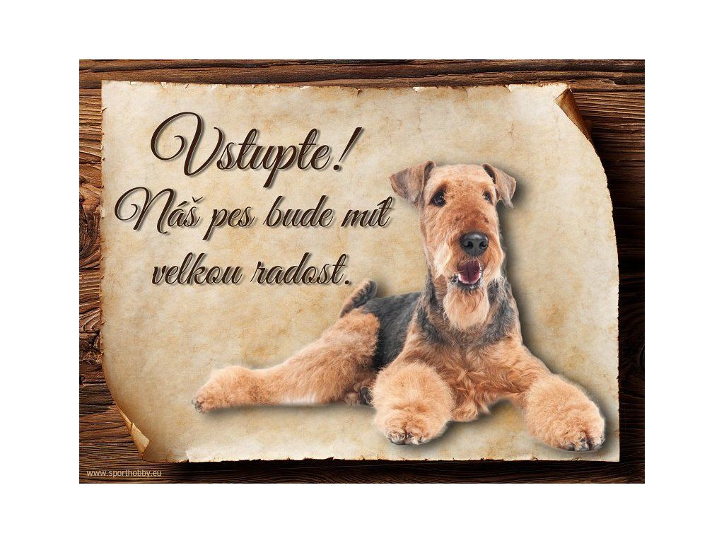 Cedulka s Airedalským Terrierem, hliníková s nápisem "Vstupte! Náš pes bude mít velkou radost!" Kovová výstražná venkovní cedulka oznamující to či ono, že se ve vašem obydlí může návštěvník setkat s vašim čtyřnohým miláčkem a jeho teritoriem. Velikosti těchto cedulek jsou 15x11,25 a 20x15 cm. Cedulky jsou tištěny sublimační technologií Grawerton přímo na plech. Cedulky dodáváme běžně se zakulacenými rohy. Pokud budete chtít na cedulku vlastní text, napište nám jej do poznámky.