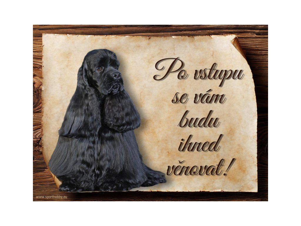 Cedulka s Americký kokršpaněl II, hliníková s nápisem "Po vstupu se vám budu hned věnovat!" Kovová výstražná venkovní cedulka oznamující to či ono, že se ve vašem obydlí může návštěvník setkat s vašim čtyřnohým miláčkem a jeho teritoriem. Velikosti těchto cedulek jsou 15x11,25 a 20x15 cm. Cedulky jsou tištěny sublimační technologií Grawerton přímo na plech. Cedulky dodáváme běžně se zakulacenými rohy. Pokud budete chtít na cedulku vlastní text, napište nám jej do poznámky.