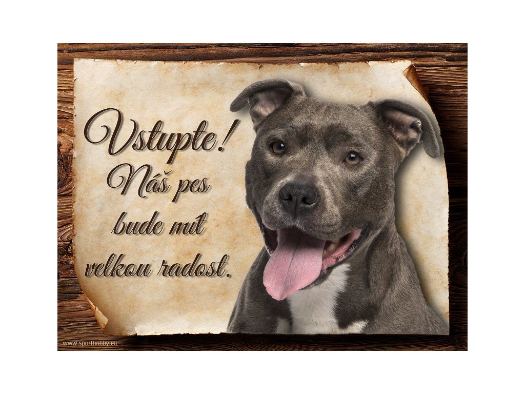 Cedulka s Americký pitbulteriér, hliníková s nápisem "Vstupte! Náš pes bude mít velkou radost!" Kovová výstražná venkovní cedulka oznamující to či ono, že se ve vašem obydlí může návštěvník setkat s vašim čtyřnohým miláčkem a jeho teritoriem. Velikosti těchto cedulek jsou 15x11,25 a 20x15 cm. Cedulky jsou tištěny sublimační technologií Grawerton přímo na plech. Cedulky dodáváme běžně se zakulacenými rohy. Pokud budete chtít na cedulku vlastní text, napište nám jej do poznámky.