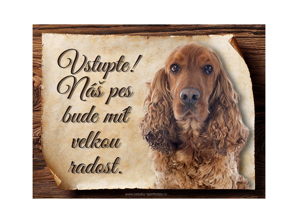 Cedulka s Anglický kokršpaněl VIII, hliníková s nápisem "Vstupte! Náš pes bude mít velkou radost!" Kovová výstražná venkovní cedulka oznamující to či ono, že se ve vašem obydlí může návštěvník setkat s vašim čtyřnohým miláčkem a jeho teritoriem. Velikosti těchto cedulek jsou 15x11,25, 20x15 a 27x20 cm. Cedulky jsou tištěny sublimační technologií Grawerton přímo na plech. Cedulky dodáváme běžně se zakulacenými rohy. Pokud budete chtít na cedulku vlastní text, napište nám jej do poznámky.
