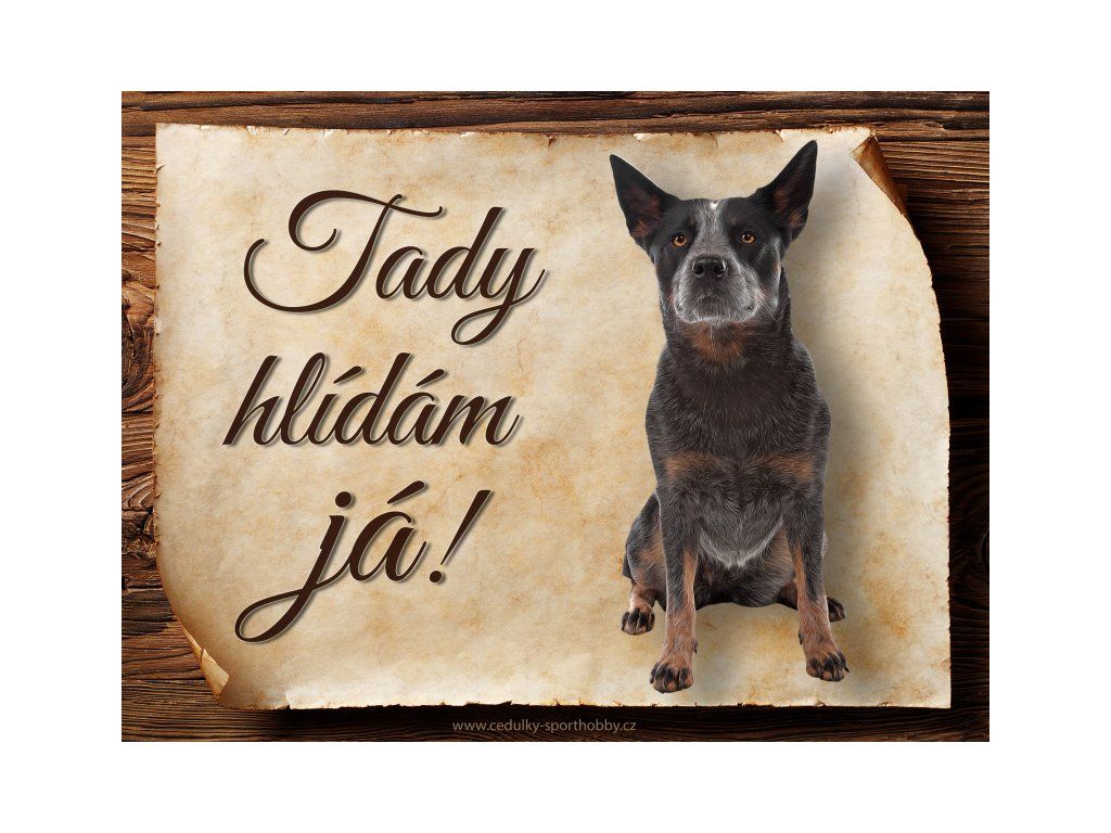 Cedulka s Australský honácký pes, hliníková s nápisem "Tady hlídám já!" Kovová výstražná venkovní cedulka oznamující to či ono, že se ve vašem obydlí může návštěvník setkat s vašim čtyřnohým miláčkem a jeho teritoriem. Velikosti těchto cedulek jsou 15x11,25 a 20x15 cm a 27x20 cm. Cedulky jsou tištěny sublimační technologií Grawerton přímo na plech. Cedulky dodáváme běžně se zakulacenými rohy. Pokud budete chtít na cedulku vlastní text, napište nám jej do poznámky.