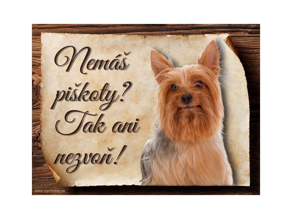 Cedulka Australský silky teriér, hliníková s nápisem "Nemáš piškoty? Tak ani nezvoň!" Kovová výstražná venkovní cedulka oznamující to či ono, že se ve vašem obydlí může návštěvník setkat s vašim čtyřnohým miláčkem a jeho teritoriem. Velikosti těchto cedulek jsou 15x11,25 a 20x15 cm. Cedulky jsou tištěny sublimační technologií Grawerton přímo na plech. Cedulky dodáváme běžně se zakulacenými rohy. Pokud budete chtít na cedulku vlastní text, napište nám jej do poznámky.