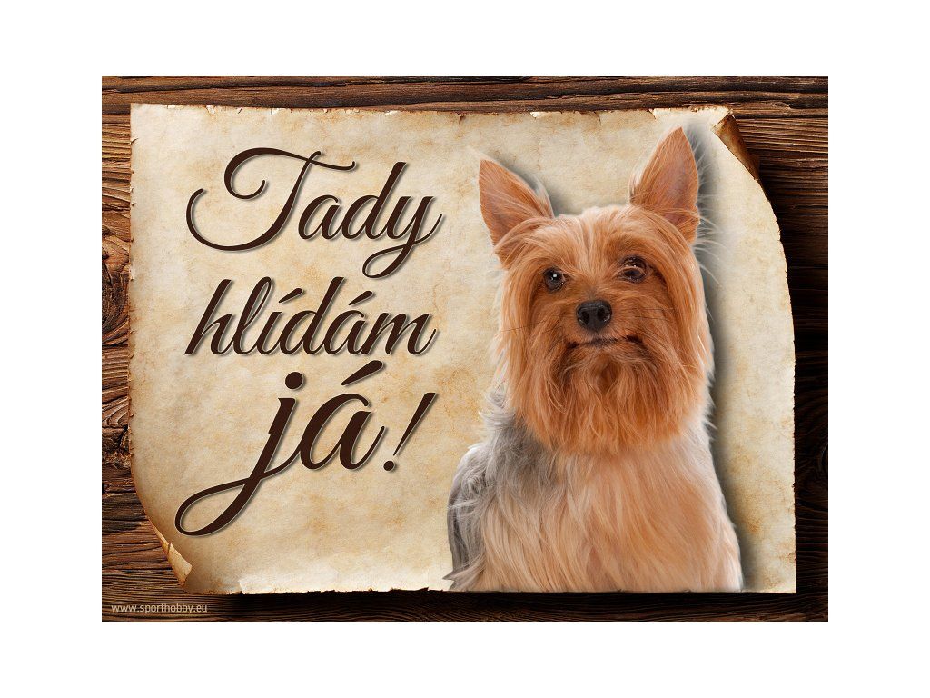 Cedulka Australský silky teriér hliníková s nápisem "Tady hlídám já!" Kovová výstražná venkovní cedulka oznamující to či ono, že se ve vašem obydlí může návštěvník setkat s vašim čtyřnohým miláčkem a jeho teritoriem. Velikosti těchto cedulek jsou 15x11,25 a 20x15 cm. Cedulky jsou tištěny sublimační technologií Grawerton přímo na plech. Cedulky dodáváme běžně se zakulacenými rohy. Pokud budete chtít na cedulku vlastní text, napište nám jej do poznámky.