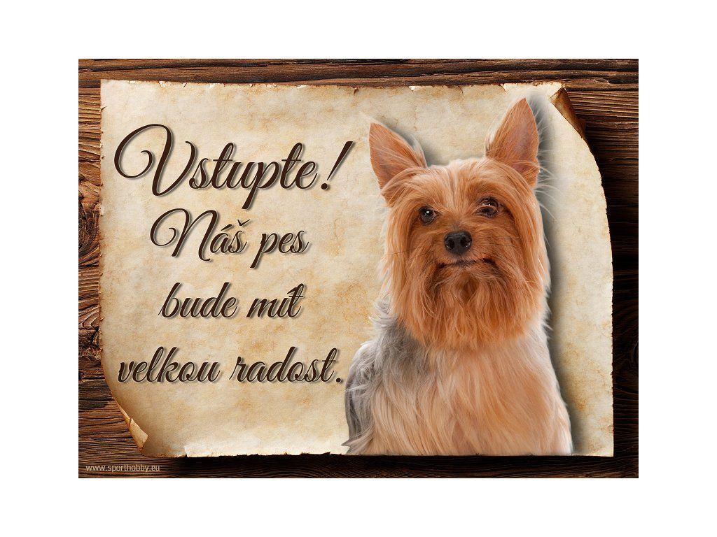 Cedulka Australský silky teriér, hliníková s nápisem "Vstupte! Náš pes bude mít velkou radost!" Kovová výstražná venkovní cedulka oznamující to či ono, že se ve vašem obydlí může návštěvník setkat s vašim čtyřnohým miláčkem a jeho teritoriem. Velikosti těchto cedulek jsou 15x11,25 a 20x15 cm. Cedulky jsou tištěny sublimační technologií Grawerton přímo na plech. Cedulky dodáváme běžně se zakulacenými rohy. Pokud budete chtít na cedulku vlastní text, napište nám jej do poznámky.