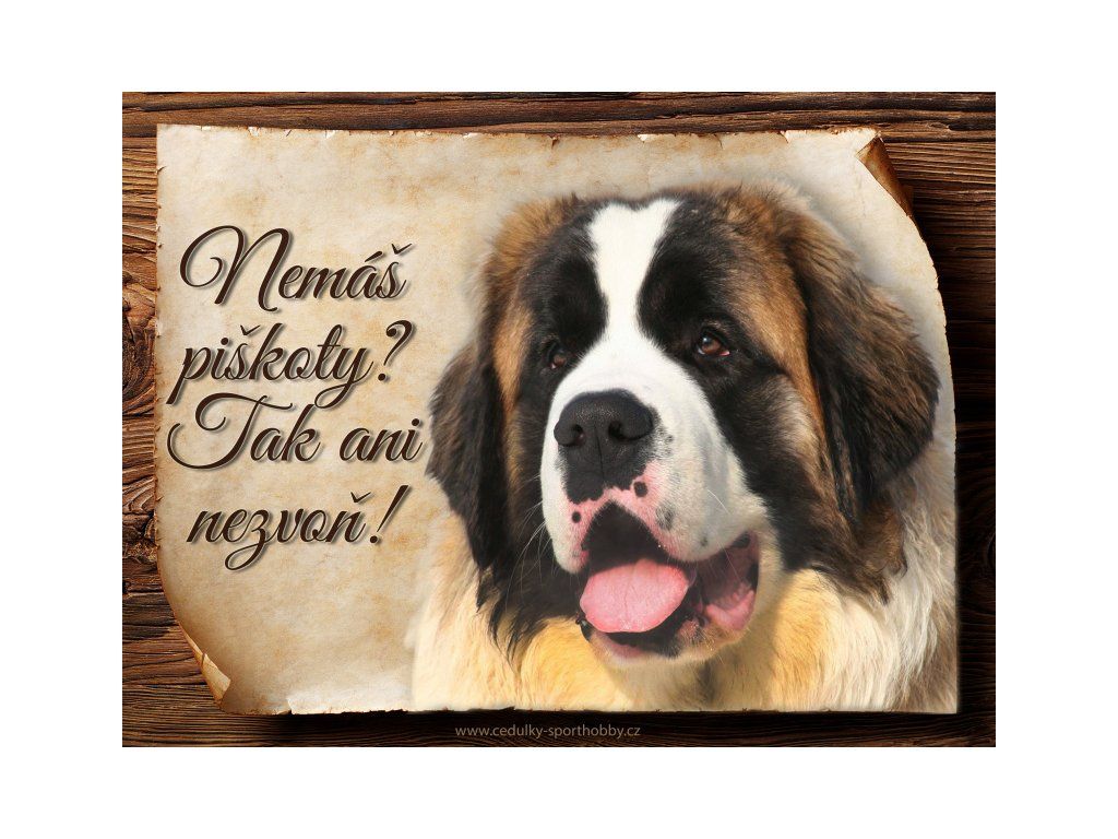 Cedulka Bernardýn, hliníková s nápisem "Nemáš piškoty? Tak ani nezvoň!" Kovová výstražná venkovní cedulka oznamující to či ono, že se ve vašem obydlí může návštěvník setkat s vašim čtyřnohým miláčkem a jeho teritoriem. Velikosti těchto cedulek jsou 15x11,25 a 20x15 cm. Cedulky jsou tištěny sublimační technologií Grawerton přímo na plech. Cedulky dodáváme běžně se zakulacenými rohy. Pokud budete chtít na cedulku vlastní text, napište nám jej do poznámky.