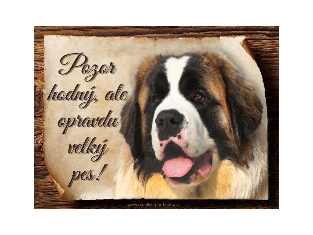 Cedulka Bernardýn, hliníková s nápisem "Pozor hodný, ale opravdu velký pes!" Kovová výstražná venkovní cedulka oznamující to či ono, že se ve vašem obydlí může návštěvník setkat s vašim čtyřnohým miláčkem a jeho teritoriem. Velikosti těchto cedulek jsou 15x11,25 a 20x15 cm. Cedulky jsou tištěny sublimační technologií Grawerton přímo na plech. Cedulky dodáváme běžně se zakulacenými rohy. Pokud budete chtít na cedulku vlastní text, napište nám jej do poznámky.