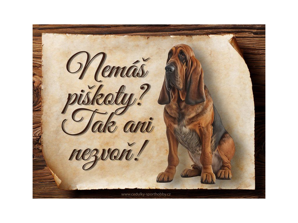 Cedulka Bloodhound, hliníková s nápisem "Nemáš piškoty? Tak ani nezvoň!" Kovová výstražná venkovní cedulka oznamující to či ono, že se ve vašem obydlí může návštěvník setkat s vašim čtyřnohým miláčkem a jeho teritoriem. Velikosti těchto cedulek jsou 15x11,25 a 20x15 cm a 27x20 cm. Cedulky jsou tištěny sublimační technologií Grawerton přímo na plech. Cedulky dodáváme běžně se zakulacenými rohy. Pokud budete chtít na cedulku vlastní text, napište nám jej do poznámky.