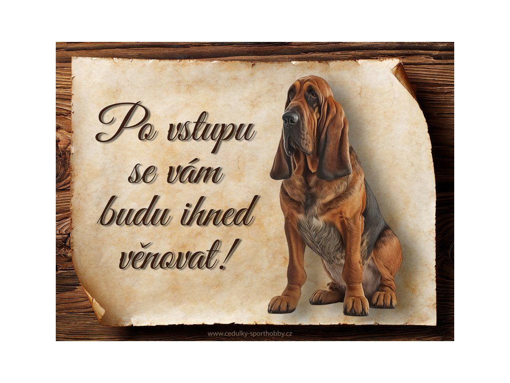 Cedulka s Bloodhound, hliníková s nápisem "Po vstupu se vám budu hned věnovat!" Kovová výstražná venkovní cedulka oznamující to či ono, že se ve vašem obydlí může návštěvník setkat s vašim čtyřnohým miláčkem a jeho teritoriem. Velikosti těchto cedulek jsou 15x11,25 a 20x15 cm a 27x20 cm. Cedulky jsou tištěny sublimační technologií Grawerton přímo na plech. Cedulky dodáváme běžně se zakulacenými rohy. Pokud budete chtít na cedulku vlastní text, napište nám jej do poznámky.