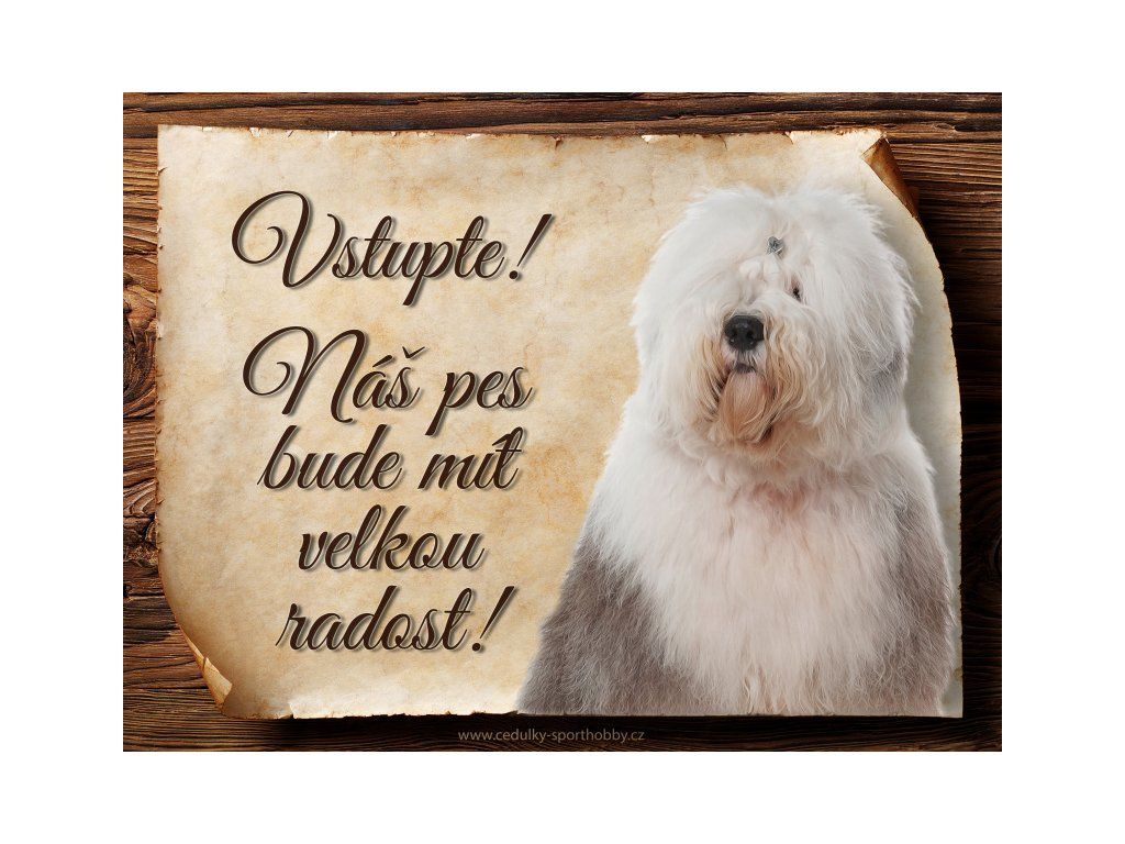 Cedulka s Bobtail, hliníková s nápisem "Vstupte! Náš pes bude mít velkou radost!" Kovová výstražná venkovní cedulka oznamující to či ono, že se ve vašem obydlí může návštěvník setkat s vašim čtyřnohým miláčkem a jeho teritoriem. Velikosti těchto cedulek jsou 15x11,25, 20x15 a 27x20 cm. Cedulky jsou tištěny sublimační technologií Grawerton přímo na plech. Cedulky dodáváme běžně se zakulacenými rohy. Pokud budete chtít na cedulku vlastní text, napište nám jej do poznámky.