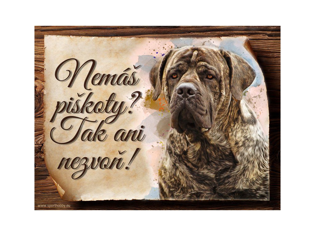 Cedulka s Boerboel, hliníková s nápisem "Nemáš piškoty? Tak ani nezvoň!" Kovová výstražná venkovní cedulka oznamující to či ono, že se ve vašem obydlí může návštěvník setkat s vašim čtyřnohým miláčkem a jeho teritoriem. Velikosti těchto cedulek jsou 15x11,25 a 20x15 cm. Cedulky jsou tištěny sublimační technologií Grawerton přímo na plech. Cedulky dodáváme běžně se zakulacenými rohy. Pokud budete chtít na cedulku vlastní text, napište nám jej do poznámky.