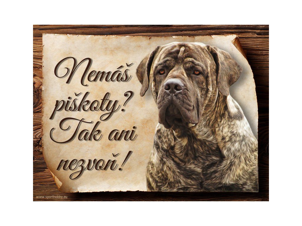 Cedulka s Boerboel, hliníková s nápisem "Nemáš piškoty? Tak ani nezvoň!" Kovová výstražná venkovní cedulka oznamující to či ono, že se ve vašem obydlí může návštěvník setkat s vašim čtyřnohým miláčkem a jeho teritoriem. Velikosti těchto cedulek jsou 15x11,25 a 20x15 cm. Cedulky jsou tištěny sublimační technologií Grawerton přímo na plech. Cedulky dodáváme běžně se zakulacenými rohy. Pokud budete chtít na cedulku vlastní text, napište nám jej do poznámky.