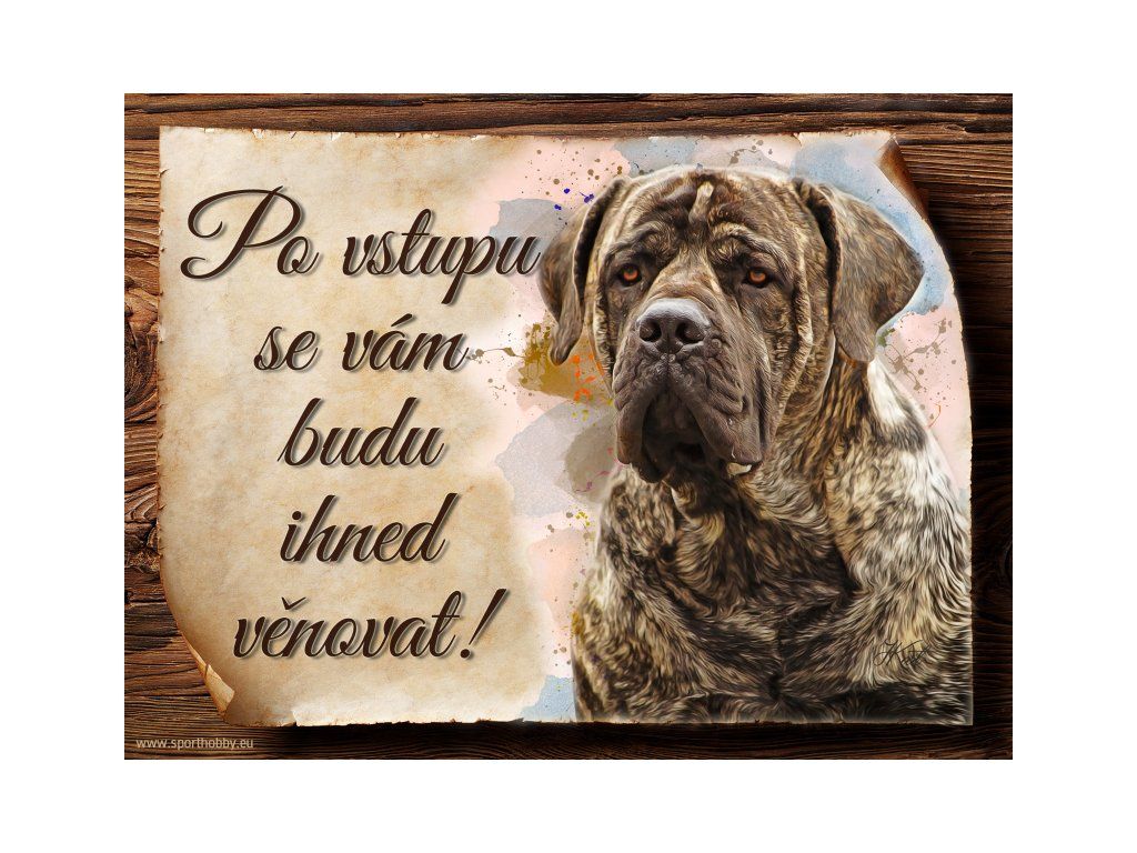 Cedulka s Boerboel, hliníková s nápisem "Po vstupu se vám budu hned věnovat!" Kovová výstražná venkovní cedulka oznamující to či ono, že se ve vašem obydlí může návštěvník setkat s vašim čtyřnohým miláčkem a jeho teritoriem. Velikosti těchto cedulek jsou 15x11,25 a 20x15 cm. Cedulky jsou tištěny sublimační technologií Grawerton přímo na plech. Cedulky dodáváme běžně se zakulacenými rohy. Pokud budete chtít na cedulku vlastní text, napište nám jej do poznámky.
