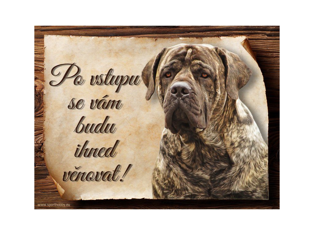 Cedulka s Boerboel, hliníková s nápisem "Po vstupu se vám budu hned věnovat!" Kovová výstražná venkovní cedulka oznamující to či ono, že se ve vašem obydlí může návštěvník setkat s vašim čtyřnohým miláčkem a jeho teritoriem. Velikosti těchto cedulek jsou 15x11,25 a 20x15 cm. Cedulky jsou tištěny sublimační technologií Grawerton přímo na plech. Cedulky dodáváme běžně se zakulacenými rohy. Pokud budete chtít na cedulku vlastní text, napište nám jej do poznámky.