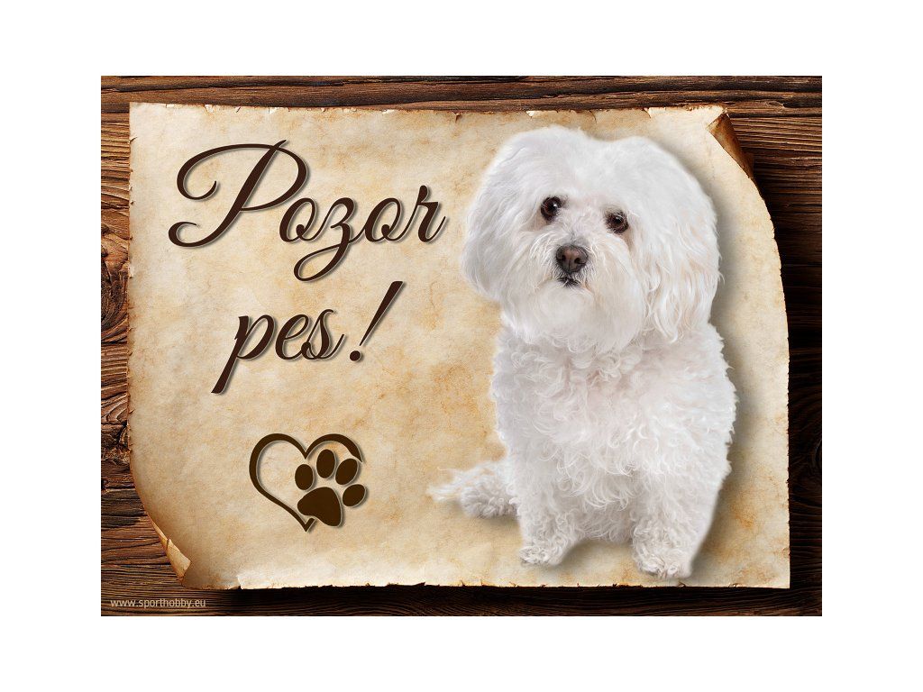 Cedulka Boloňský psík hliníková s nápisem "Pozor pes!" Kovová výstražná venkovní cedulka oznamující to či ono, že se ve vašem obydlí může návštěvník setkat s vašim čtyřnohým miláčkem a jeho teritoriem. Velikosti těchto cedulek jsou 15x11,25 a 20x15 cm. Cedulky jsou tištěny sublimační technologií Grawerton přímo na plech. Cedulky dodáváme běžně se zakulacenými rohy. Pokud budete chtít na cedulku vlastní text, napište nám jej do poznámky.