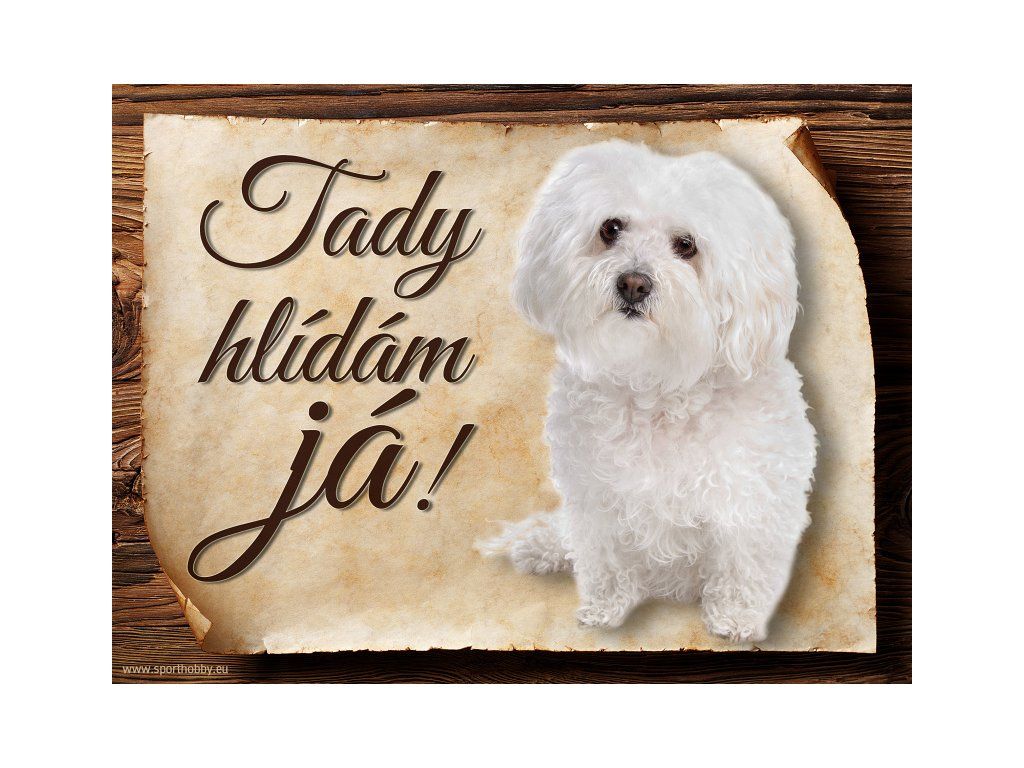 Cedulka s Boloňský psík, hliníková s nápisem "Tady hlídám já!" Kovová výstražná venkovní cedulka oznamující to či ono, že se ve vašem obydlí může návštěvník setkat s vašim čtyřnohým miláčkem a jeho teritoriem. Velikosti těchto cedulek jsou 15x11,25 a 20x15 cm. Cedulky jsou tištěny sublimační technologií Grawerton přímo na plech. Cedulky dodáváme běžně se zakulacenými rohy. Pokud budete chtít na cedulku vlastní text, napište nám jej do poznámky.