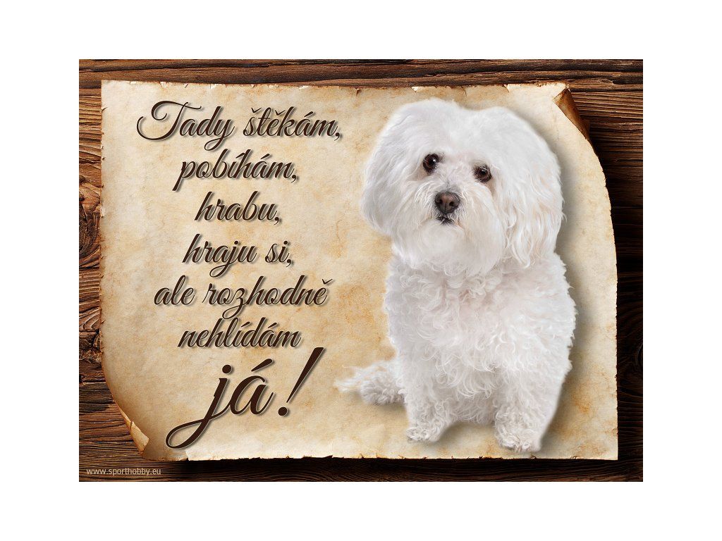 Cedulka Boloňský psík, hliníková s nápisem "Tady štěkám, pobíhám, hrabu, hraju si, ale rozhodně nehlídám já!!" Kovová výstražná venkovní cedulka oznamující to či ono, že se ve vašem obydlí může návštěvník setkat s vašim čtyřnohým miláčkem a jeho teritoriem. Velikosti těchto cedulek jsou 15x11,25 a 20x15 cm. Cedulky jsou tištěny sublimační technologií Grawerton přímo na plech. Cedulky dodáváme běžně se zakulacenými rohy. Pokud budete chtít na cedulku vlastní text, napište nám jej do poznámky.