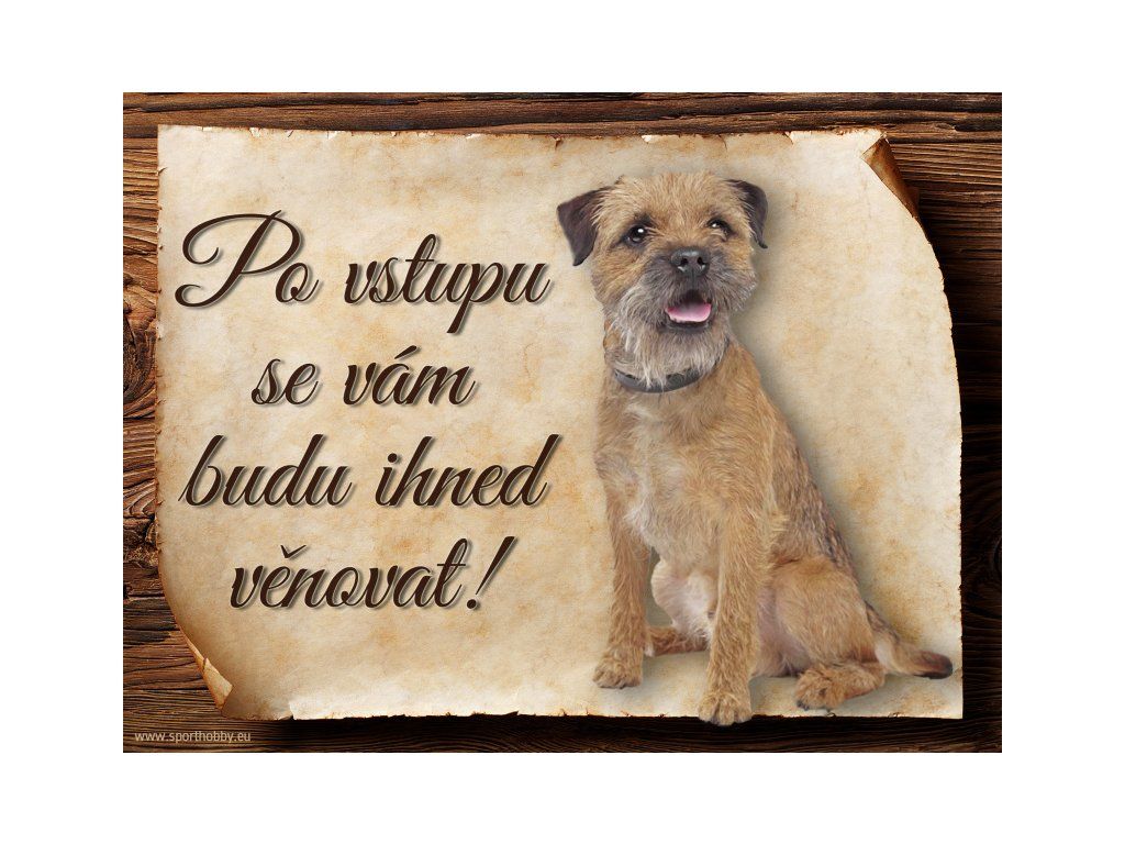 Cedulka s Border teriér, hliníková s nápisem "Po vstupu se vám budu hned věnovat!" Kovová výstražná venkovní cedulka oznamující to či ono, že se ve vašem obydlí může návštěvník setkat s vašim čtyřnohým miláčkem a jeho teritoriem. Velikosti těchto cedulek jsou 15x11,25 a 20x15 cm. Cedulky jsou tištěny sublimační technologií Grawerton přímo na plech. Cedulky dodáváme běžně se zakulacenými rohy. Pokud budete chtít na cedulku vlastní text, napište nám jej do poznámky.