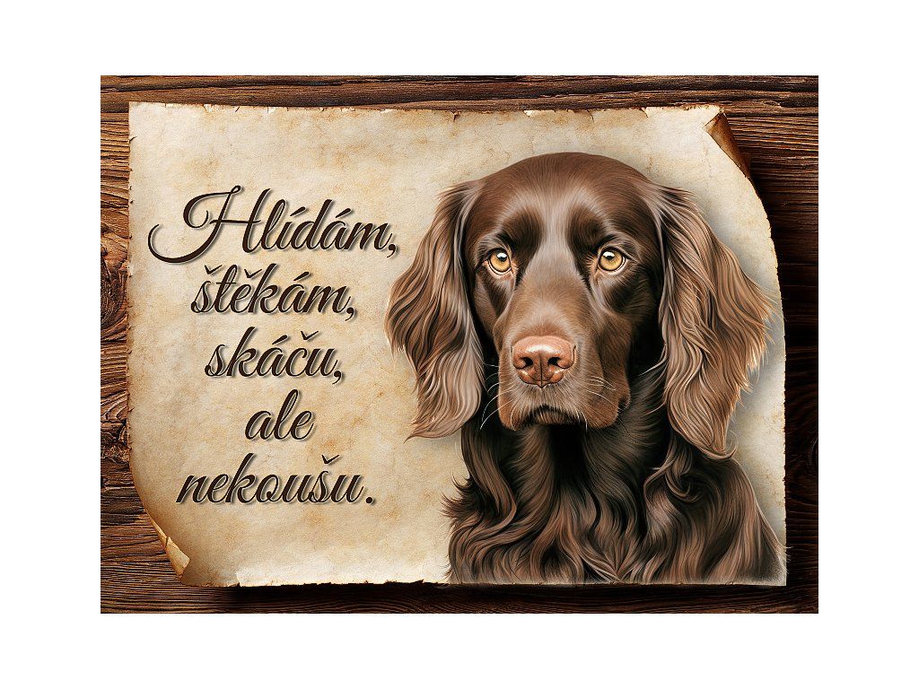 Cedulka s Boykin španěl, hliníková s nápisem "Hlídám, štěkám, skáču, ale nekoušu" Kovová výstražná venkovní cedulka oznamující to či ono, že se ve vašem obydlí může návštěvník setkat s vašim čtyřnohým miláčkem a jeho teritoriem. Velikosti těchto cedulek jsou 15x11,25 a 20x15 a 27x20 cm. Cedulky jsou tištěny sublimační technologií Grawerton přímo na plech. Cedulky dodáváme běžně se zakulacenými rohy. Pokud budete chtít na cedulku vlastní text, napište nám jej do poznámky.