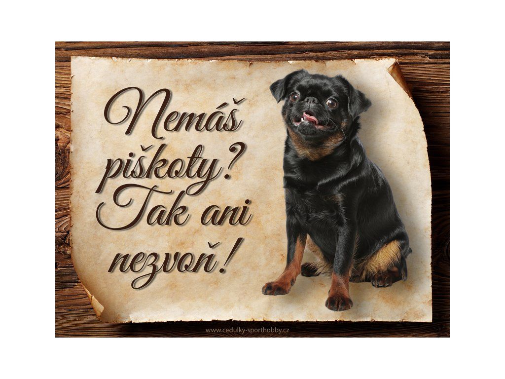 Cedulka Brabantík, hliníková s nápisem "Nemáš piškoty? Tak ani nezvoň!" Kovová výstražná venkovní cedulka oznamující to či ono, že se ve vašem obydlí může návštěvník setkat s vašim čtyřnohým miláčkem a jeho teritoriem. Velikosti těchto cedulek jsou 15x11,25 a 20x15 cm. Cedulky jsou tištěny sublimační technologií Grawerton přímo na plech. Cedulky dodáváme běžně se zakulacenými rohy. Pokud budete chtít na cedulku vlastní text, napište nám jej do poznámky.
