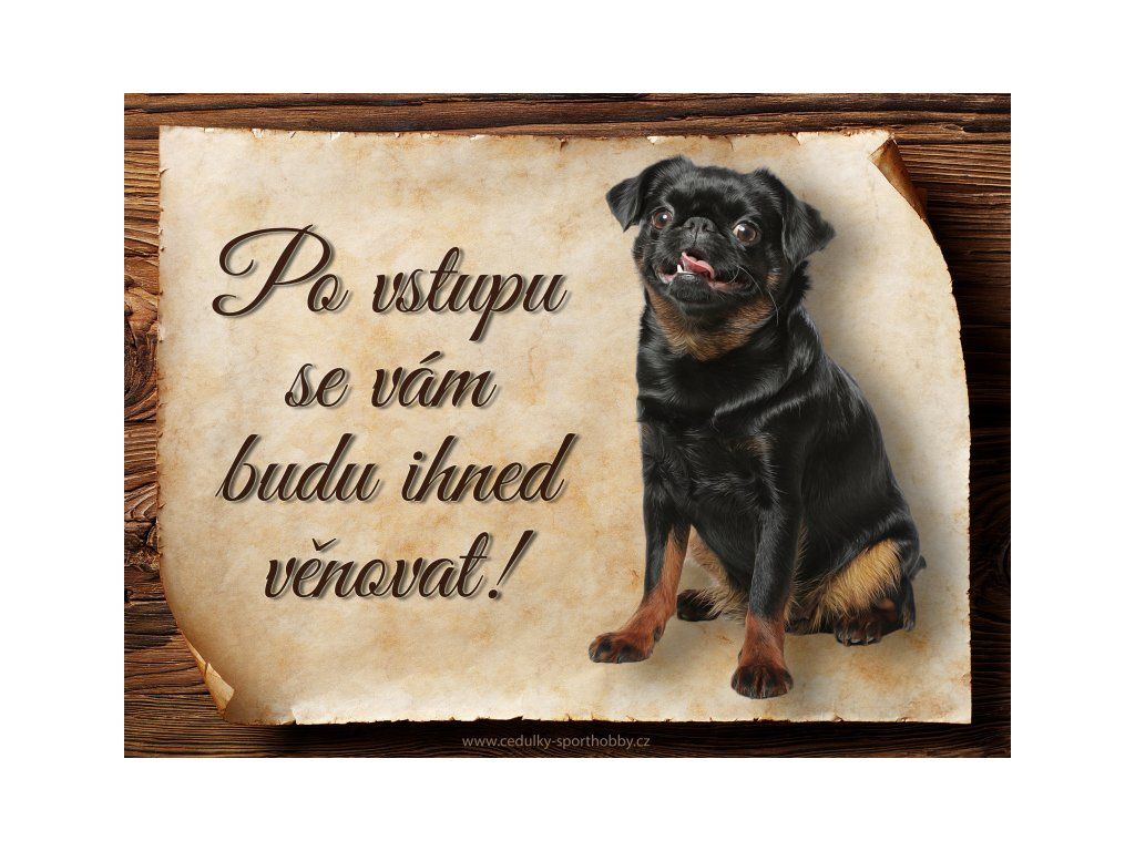 Cedulka Brabantík, hliníková s nápisem "Po vstupu se vám budu hned věnovat!" Kovová výstražná venkovní cedulka oznamující to či ono, že se ve vašem obydlí může návštěvník setkat s vašim čtyřnohým miláčkem a jeho teritoriem. Velikosti těchto cedulek jsou 15x11,25 a 20x15 cm. Cedulky jsou tištěny sublimační technologií Grawerton přímo na plech. Cedulky dodáváme běžně se zakulacenými rohy. Pokud budete chtít na cedulku vlastní text, napište nám jej do poznámky.