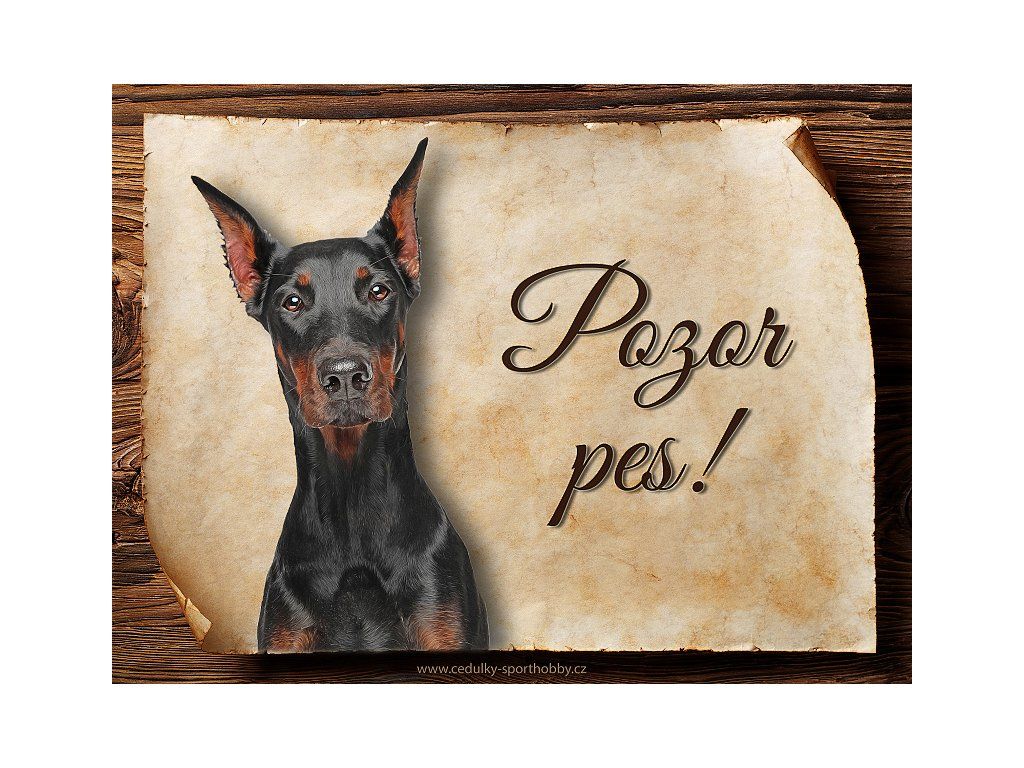 Cedulka s Dobrman I, hliníková s nápisem "Pozor pes!" Kovová výstražná venkovní cedulka oznamující to či ono, že se ve vašem obydlí může návštěvník setkat s vašim čtyřnohým miláčkem a jeho teritoriem. Velikosti těchto cedulek jsou 15x11,25 a 20x15 cm. Cedulky jsou tištěny sublimační technologií Grawerton přímo na plech. Cedulky dodáváme běžně se zakulacenými rohy. Pokud budete chtít na cedulku vlastní text, napište nám jej do poznámky.