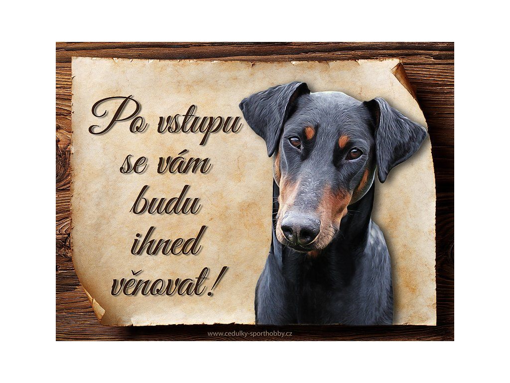 Cedulka Dobrman, hliníková s nápisem "Po vstupu se vám budu hned věnovat!" Kovová výstražná venkovní cedulka oznamující to či ono, že se ve vašem obydlí může návštěvník setkat s vašim čtyřnohým miláčkem a jeho teritoriem. Velikosti těchto cedulek jsou 15x11,25 a 20x15 cm. Cedulky jsou tištěny sublimační technologií Grawerton přímo na plech. Cedulky dodáváme běžně se zakulacenými rohy. Pokud budete chtít na cedulku vlastní text, napište nám jej do poznámky.