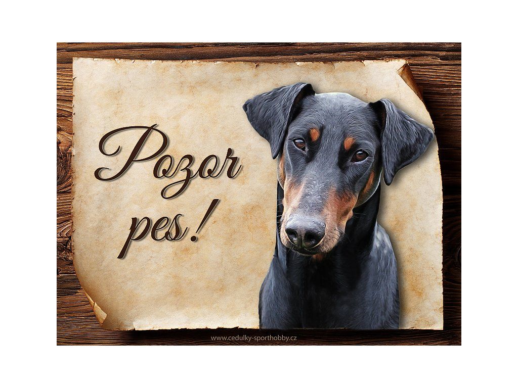Cedulka s Dobrman, hliníková s nápisem "Pozor pes!" Kovová výstražná venkovní cedulka oznamující to či ono, že se ve vašem obydlí může návštěvník setkat s vašim čtyřnohým miláčkem a jeho teritoriem. Velikosti těchto cedulek jsou 15x11,25 a 20x15 cm. Cedulky jsou tištěny sublimační technologií Grawerton přímo na plech. Cedulky dodáváme běžně se zakulacenými rohy. Pokud budete chtít na cedulku vlastní text, napište nám jej do poznámky.