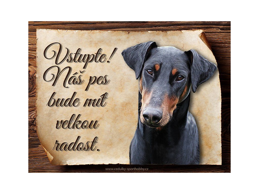 Cedulka s Dobrman, hliníková s nápisem "Vstupte! Náš pes bude mít velkou radost!" Kovová výstražná venkovní cedulka oznamující to či ono, že se ve vašem obydlí může návštěvník setkat s vašim čtyřnohým miláčkem a jeho teritoriem. Velikosti těchto cedulek jsou 15x11,25 a 20x15 cm. Cedulky jsou tištěny sublimační technologií Grawerton přímo na plech. Cedulky dodáváme běžně se zakulacenými rohy. Pokud budete chtít na cedulku vlastní text, napište nám jej do poznámky.