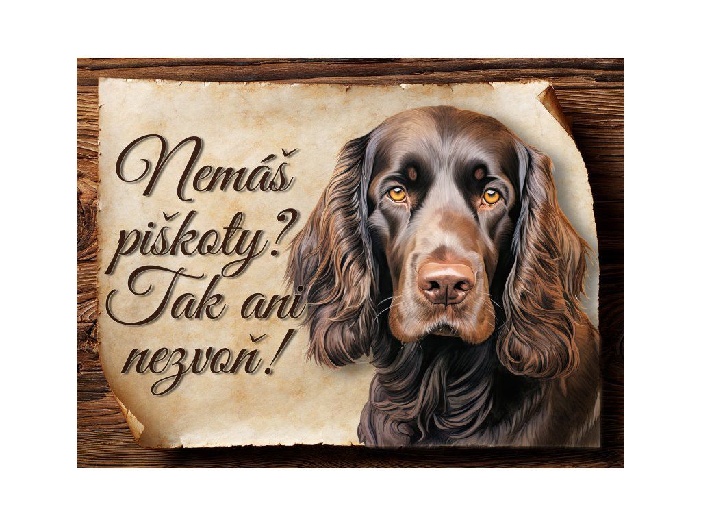 Cedulka s Field španěl, hliníková s nápisem "Nemáš piškoty? Tak ani nezvoň!" Kovová výstražná venkovní cedulka oznamující to či ono, že se ve vašem obydlí může návštěvník setkat s vašim čtyřnohým miláčkem a jeho teritoriem. Velikosti těchto cedulek jsou 15x11,25 a 20x15 a 27x20 cm. Cedulky jsou tištěny sublimační technologií Grawerton přímo na plech. Cedulky dodáváme běžně se zakulacenými rohy. Pokud budete chtít na cedulku vlastní text, napište nám jej do poznámky.