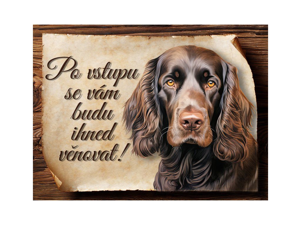 Cedulka s Field španěl, hliníková s nápisem "Po vstupu ...!" Kovová výstražná venkovní cedulka oznamující to či ono, že se ve vašem obydlí může návštěvník setkat s vašim čtyřnohým miláčkem a jeho teritoriem. Velikosti těchto cedulek jsou 15x11,25 a 20x15 a 27x20 cm. Cedulky jsou tištěny sublimační technologií Grawerton přímo na plech. Cedulky dodáváme běžně se zakulacenými rohy. Pokud budete chtít na cedulku vlastní text, napište nám jej do poznámky.
