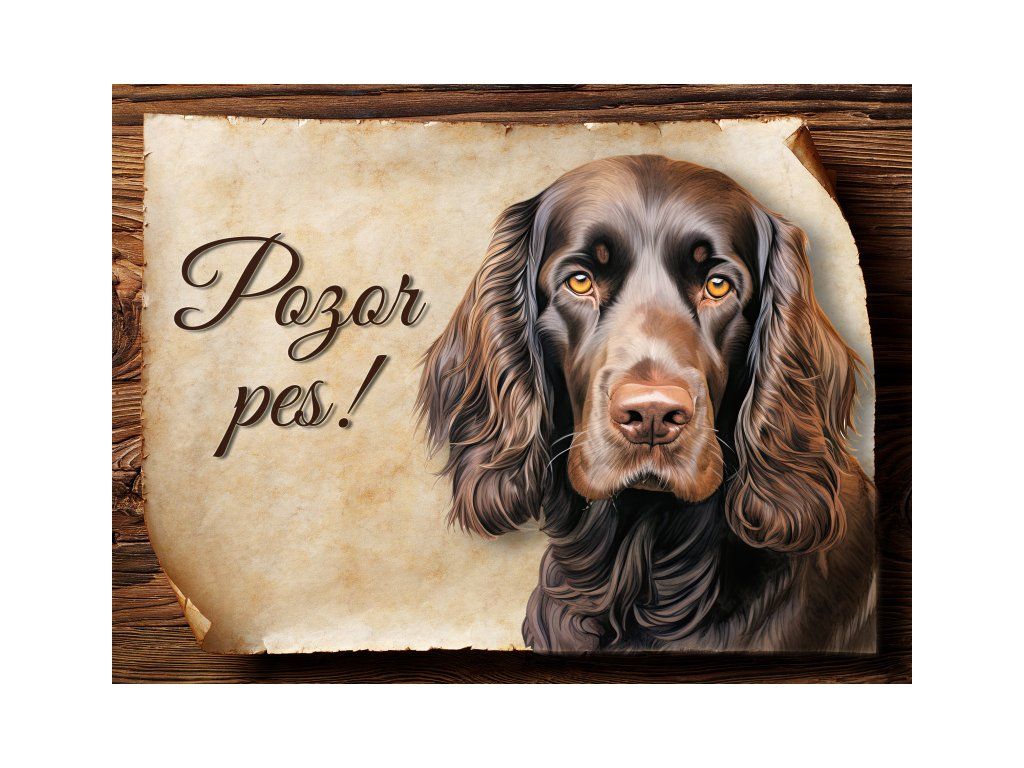 Cedulka s Field španěl, hliníková s nápisem "Pozor pes!" Kovová výstražná venkovní cedulka oznamující to či ono, že se ve vašem obydlí může návštěvník setkat s vašim čtyřnohým miláčkem a jeho teritoriem. Velikosti těchto cedulek jsou 15x11,25 a 20x15 a 27x20 cm. Cedulky jsou tištěny sublimační technologií Grawerton přímo na plech. Cedulky dodáváme běžně se zakulacenými rohy. Pokud budete chtít na cedulku vlastní text, napište nám jej do poznámky.