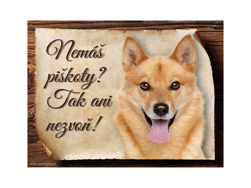 Cedulka Finský špic hliníková s nápisem "Nemáš piškoty? Tak ani nezvoň!" Kovová výstražná venkovní cedulka oznamující to či ono, že se ve vašem obydlí může návštěvník setkat s vašim čtyřnohým miláčkem a jeho teritoriem. Velikosti těchto cedulek jsou 15x11,5 a 20x15 cm. Cedulky jsou tištěny sublimační technologií Grawerton přímo na plech. Cedulky dodáváme běžně se zakulacenými rohy. Pokud budete chtít na cedulku vlastní text, napište nám jej do poznámky.