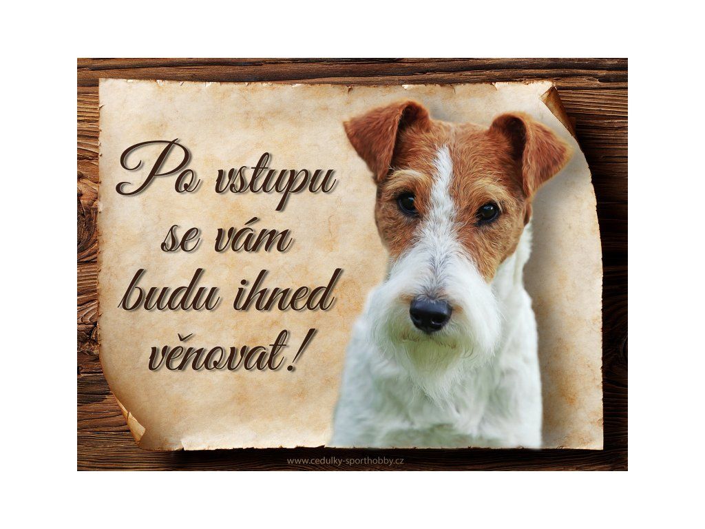 Cedulka s Foxterier, hliníková s nápisem "Po vstupu ...!" Kovová výstražná venkovní cedulka oznamující to či ono, že se ve vašem obydlí může návštěvník setkat s vašim čtyřnohým miláčkem a jeho teritoriem. Velikosti těchto cedulek jsou 15x11,25 a 20x15 a 27x20 cm. Cedulky jsou tištěny sublimační technologií Grawerton přímo na plech. Cedulky dodáváme běžně se zakulacenými rohy. Pokud budete chtít na cedulku vlastní text, napište nám jej do poznámky.