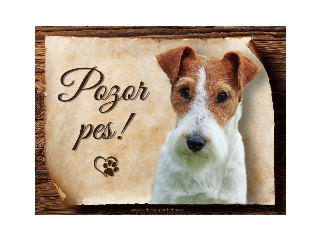 Cedulka s Foxterier, hliníková s nápisem "Pozor pes!" Kovová výstražná venkovní cedulka oznamující to či ono, že se ve vašem obydlí může návštěvník setkat s vašim čtyřnohým miláčkem a jeho teritoriem. Velikosti těchto cedulek jsou 15x11,25 a 20x15 a 27x20 cm. Cedulky jsou tištěny sublimační technologií Grawerton přímo na plech. Cedulky dodáváme běžně se zakulacenými rohy. Pokud budete chtít na cedulku vlastní text, napište nám jej do poznámky.