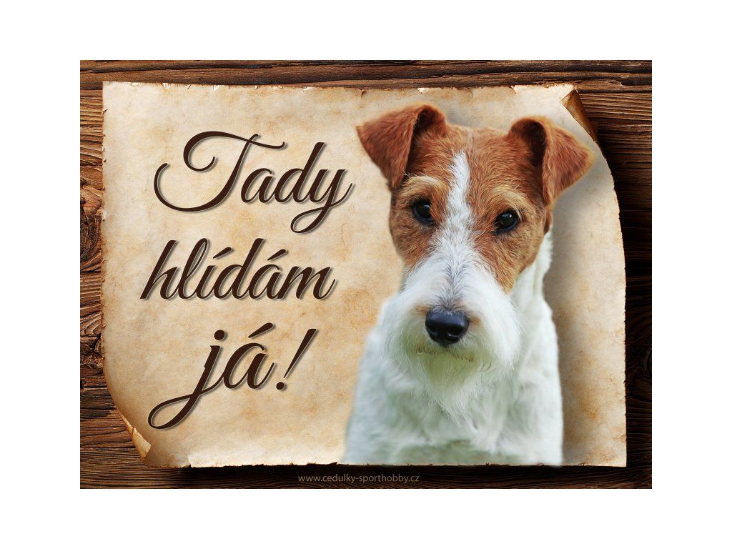 Cedulka s Foxterier, hliníková s nápisem "Tady hlídám já!" Kovová výstražná venkovní cedulka oznamující to či ono, že se ve vašem obydlí může návštěvník setkat s vašim čtyřnohým miláčkem a jeho teritoriem. Velikosti těchto cedulek jsou 15x11,25 a 20x15 a 27x20 cm. Cedulky jsou tištěny sublimační technologií Grawerton přímo na plech. Cedulky dodáváme běžně se zakulacenými rohy. Pokud budete chtít na cedulku vlastní text, napište nám jej do poznámky.