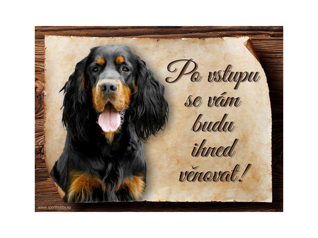Cedulka Gordonsetr, hliníková s nápisem "Po vstupu se vám budu hned věnovat!" Kovová výstražná venkovní cedulka oznamující to či ono, že se ve vašem obydlí může návštěvník setkat s vašim čtyřnohým miláčkem a jeho teritoriem. Velikosti těchto cedulek jsou 15x11,25 a 20x15 cm. Cedulky jsou tištěny sublimační technologií Grawerton přímo na plech. Cedulky dodáváme běžně se zakulacenými rohy. Pokud budete chtít na cedulku vlastní text, napište nám jej do poznámky.