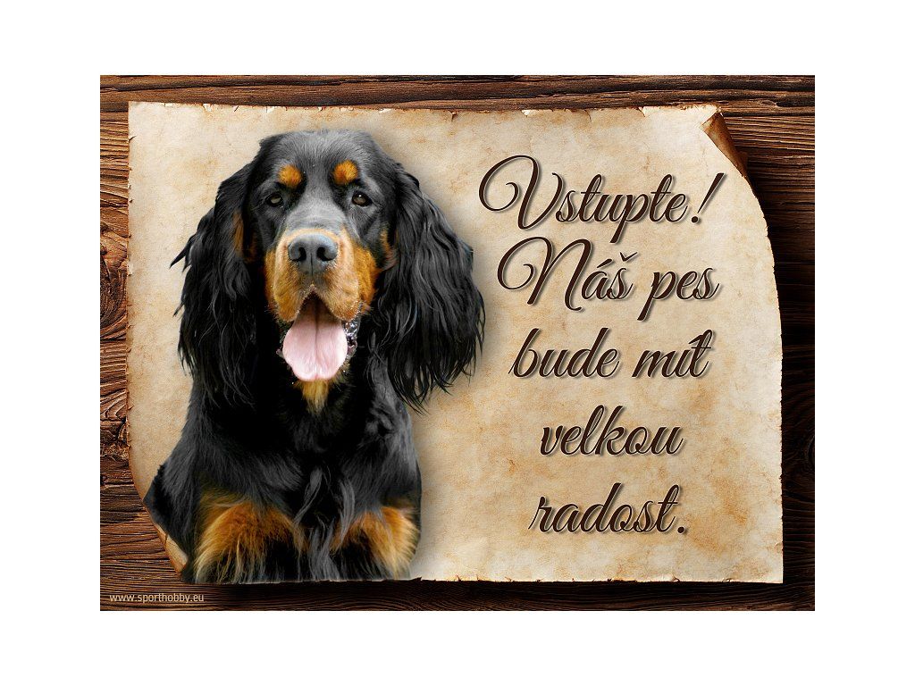 Cedulka Gordonsetr, hliníková s nápisem "Vstupte! Náš pes bude mít velkou radost!" Kovová výstražná venkovní cedulka oznamující to či ono, že se ve vašem obydlí může návštěvník setkat s vašim čtyřnohým miláčkem a jeho teritoriem. Velikosti těchto cedulek jsou 15x11,25 a 20x15 cm. Cedulky jsou tištěny sublimační technologií Grawerton přímo na plech. Cedulky dodáváme běžně se zakulacenými rohy. Pokud budete chtít na cedulku vlastní text, napište nám jej do poznámky.
