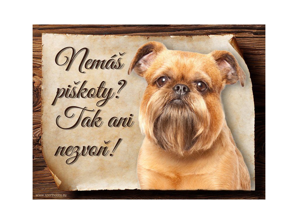 Cedulka Grifonek hliníková s nápisem "Nemáš piškoty? Tak ani nezvoň!" Kovová výstražná venkovní cedulka oznamující to či ono, že se ve vašem obydlí může návštěvník setkat s vašim čtyřnohým miláčkem a jeho teritoriem. Velikosti těchto cedulek jsou 15x11,5 a 20x15 cm. Cedulky jsou tištěny sublimační technologií Grawerton přímo na plech. Cedulky dodáváme běžně se zakulacenými rohy. Pokud budete chtít na cedulku vlastní text, napište nám jej do poznámky.