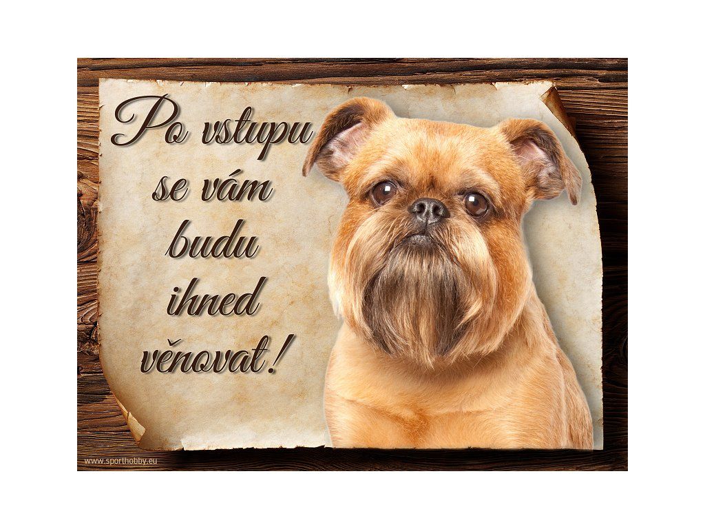 Cedulka Grifonek hliníková s nápisem "Po vstupu se vám budu hned věnovat!" Kovová výstražná venkovní cedulka oznamující to či ono, že se ve vašem obydlí může návštěvník setkat s vašim čtyřnohým miláčkem a jeho teritoriem. Velikosti těchto cedulek jsou 15x11,25 a 20x15 cm. Cedulky jsou tištěny sublimační technologií Grawerton přímo na plech. Cedulky dodáváme běžně se zakulacenými rohy. Pokud budete chtít na cedulku vlastní text, napište nám jej do poznámky.