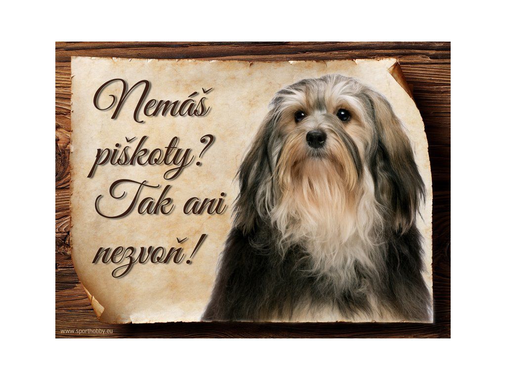 Cedulka Havanský psík II, hliníková s nápisem "Nemáš piškoty? Tak ani nezvoň!" Kovová výstražná venkovní cedulka oznamující to či ono, že se ve vašem obydlí může návštěvník setkat s vašim čtyřnohým miláčkem a jeho teritoriem. Velikosti těchto cedulek jsou 15x11,25 a 20x15 cm. Cedulky jsou tištěny sublimační technologií Grawerton přímo na plech. Cedulky dodáváme běžně se zakulacenými rohy. Pokud budete chtít na cedulku vlastní text, napište nám jej do poznámky.