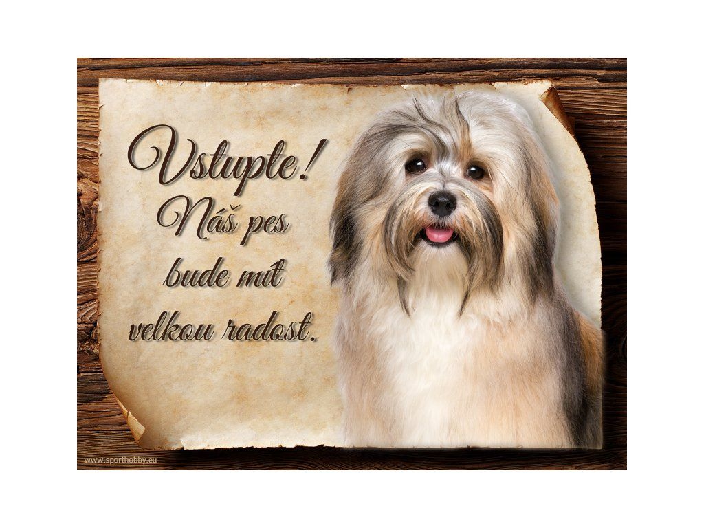 Cedulka Havanský psík, hliníková s nápisem "Vstupte! Náš pes bude mít velkou radost!" Kovová výstražná venkovní cedulka oznamující to či ono, že se ve vašem obydlí může návštěvník setkat s vašim čtyřnohým miláčkem a jeho teritoriem. Velikosti těchto cedulek jsou 15x11,25 a 20x15 cm. Cedulky jsou tištěny sublimační technologií Grawerton přímo na plech. Cedulky dodáváme běžně se zakulacenými rohy. Pokud budete chtít na cedulku vlastní text, napište nám jej do poznámky.
