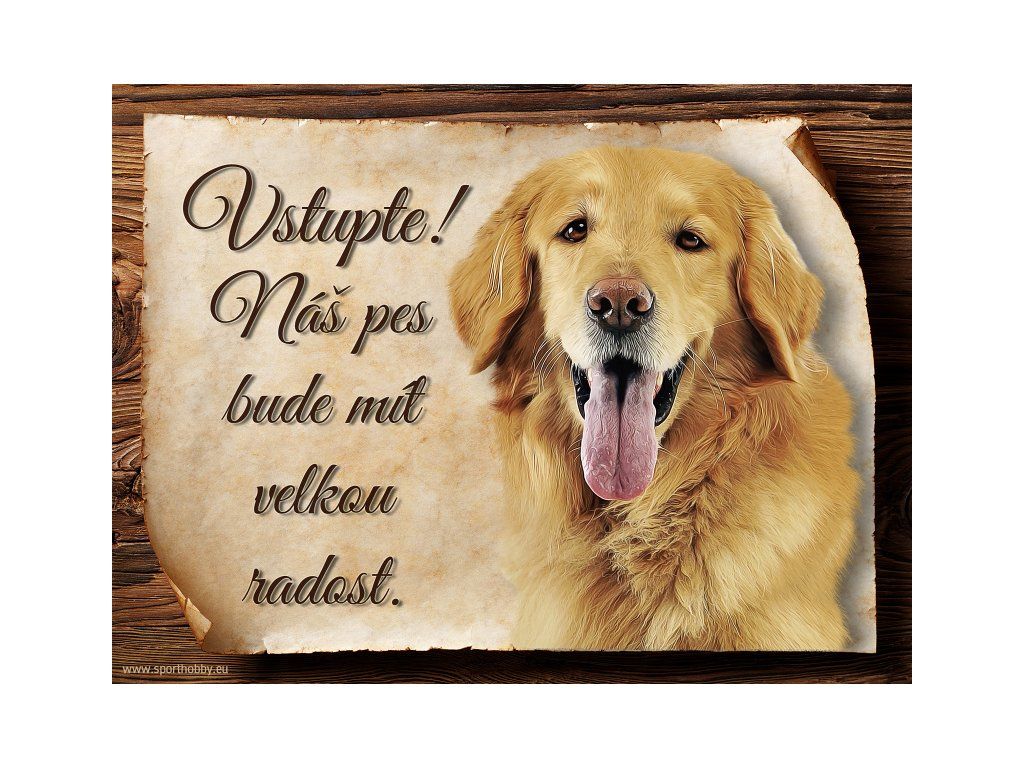 Cedulka s Hovawart III, hliníková s nápisem "Vstupte! Náš pes bude mít velkou radost!" Kovová výstražná venkovní tabulka oznamující to či ono, že se ve vašem obydlí může návštěvník setkat s vašim čtyřnohým miláčkem a jeho teritoriem. Velikosti těchto cedulek jsou 15x11,25, 20x15 cm a 27x20. Cedulky jsou tištěny sublimační technologií Grawerton přímo na plech. Cedulky dodáváme běžně se zakulacenými rohy. Pokud budete chtít na cedulku vlastní text, napište nám jej do poznámky.