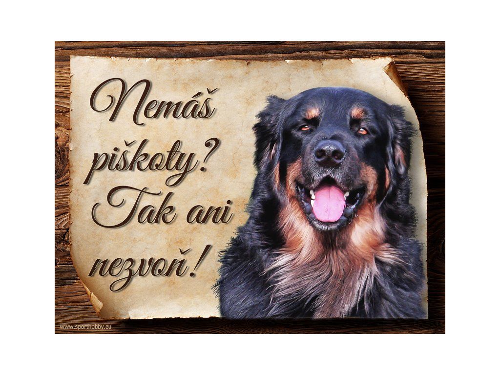 Cedulka s Hovawart, hliníková s nápisem "Nemáš piškoty? Tak ani nezvoň!" Kovová výstražná venkovní cedulka oznamující to či ono, že se ve vašem obydlí může návštěvník setkat s vašim čtyřnohým miláčkem a jeho teritoriem. Velikosti těchto cedulek jsou 15x11,25 a 20x15 cm. Cedulky jsou tištěny sublimační technologií Grawerton přímo na plech. Cedulky dodáváme běžně se zakulacenými rohy. Pokud budete chtít na cedulku vlastní text, napište nám jej do poznámky.