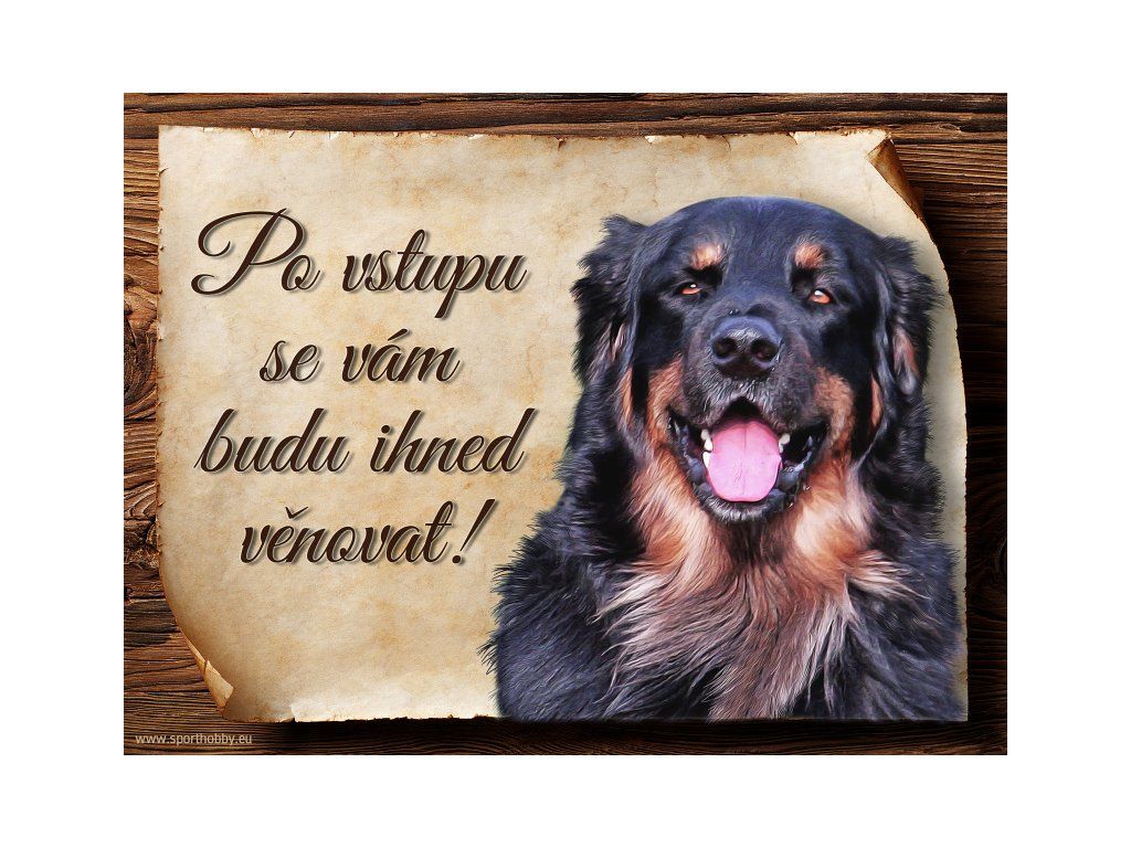 Cedulka s Hovawart, hliníková s nápisem "Po vstupu se vám budu hned věnovat!" Kovová výstražná venkovní cedulka oznamující to či ono, že se ve vašem obydlí může návštěvník setkat s vašim čtyřnohým miláčkem a jeho teritoriem. Velikosti těchto cedulek jsou 15x11,25 a 20x15 cm. Cedulky jsou tištěny sublimační technologií Grawerton přímo na plech. Cedulky dodáváme běžně se zakulacenými rohy. Pokud budete chtít na cedulku vlastní text, napište nám jej do poznámky.