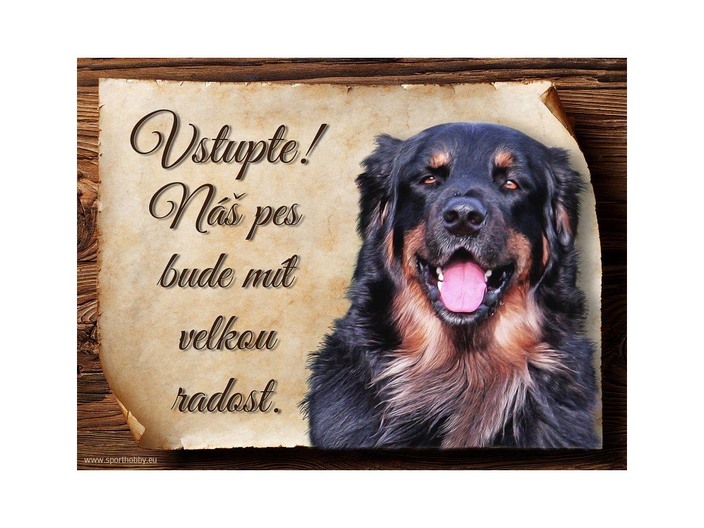 Cedulka s Hovawart, hliníková s nápisem "Vstupte! Náš pes bude mít velkou radost!" Kovová výstražná venkovní tabulka oznamující to či ono, že se ve vašem obydlí může návštěvník setkat s vašim čtyřnohým miláčkem a jeho teritoriem. Velikosti těchto cedulek jsou 15x11,25 a 20x15 cm. Cedulky jsou tištěny sublimační technologií Grawerton přímo na plech. Cedulky dodáváme běžně se zakulacenými rohy. Pokud budete chtít na cedulku vlastní text, napište nám jej do poznámky.