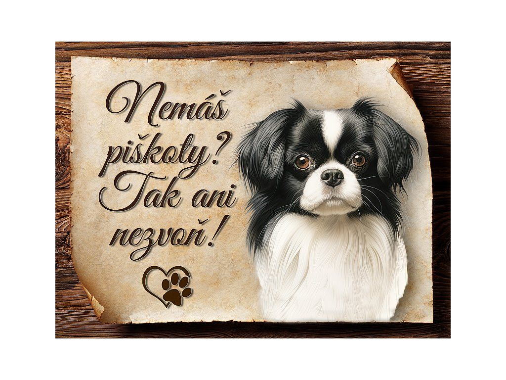 Cedulka Japan-chin hliníková s nápisem "Nemáš piškoty? Tak ani nezvoň!" Kovová výstražná venkovní cedulka oznamující to či ono, že se ve vašem obydlí může návštěvník setkat s vašim čtyřnohým miláčkem a jeho teritoriem. Velikosti těchto cedulek jsou 15x11,5 a 20x15 cm. Cedulky jsou tištěny sublimační technologií Grawerton přímo na plech. Cedulky dodáváme běžně se zakulacenými rohy. Pokud budete chtít na cedulku vlastní text, napište nám jej do poznámky.