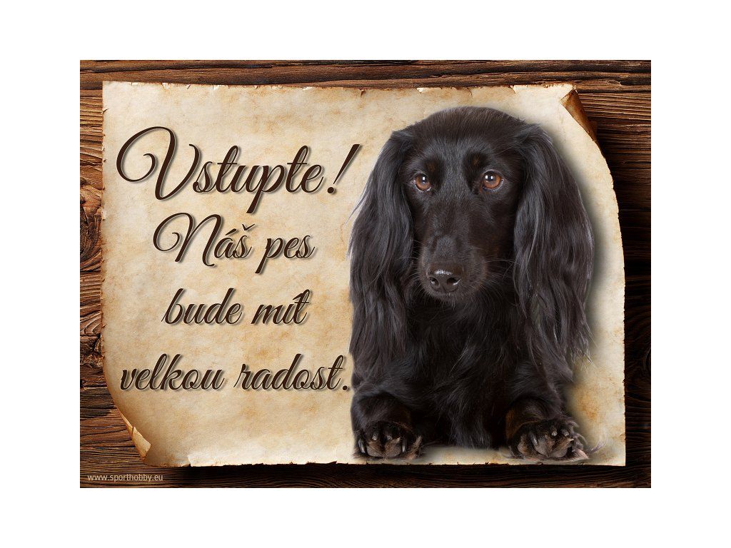 Cedulka Jezevčík černý dlouhosrstý, hliníková s nápisem "Vstupte! Náš pes bude mít velkou radost!" Kovová výstražná venkovní cedulka oznamující to či ono, že se ve vašem obydlí může návštěvník setkat s vašim čtyřnohým miláčkem a jeho teritoriem. Velikosti těchto cedulek jsou 15x11,25 a 20x15 cm. Cedulky jsou tištěny sublimační technologií Grawerton přímo na plech. Cedulky dodáváme běžně se zakulacenými rohy. Pokud budete chtít na cedulku vlastní text, napište nám jej do poznámky.