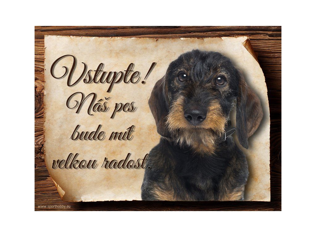 Cedulka Jezevčík černý drsnosrstý, hliníková s nápisem "Vstupte! Náš pes bude mít velkou radost!" Kovová výstražná venkovní cedulka oznamující to či ono, že se ve vašem obydlí může návštěvník setkat s vašim čtyřnohým miláčkem a jeho teritoriem. Velikosti těchto cedulek jsou 15x11,25 a 20x15 cm. Cedulky jsou tištěny sublimační technologií Grawerton přímo na plech. Cedulky dodáváme běžně se zakulacenými rohy. Pokud budete chtít na cedulku vlastní text, napište nám jej do poznámky.