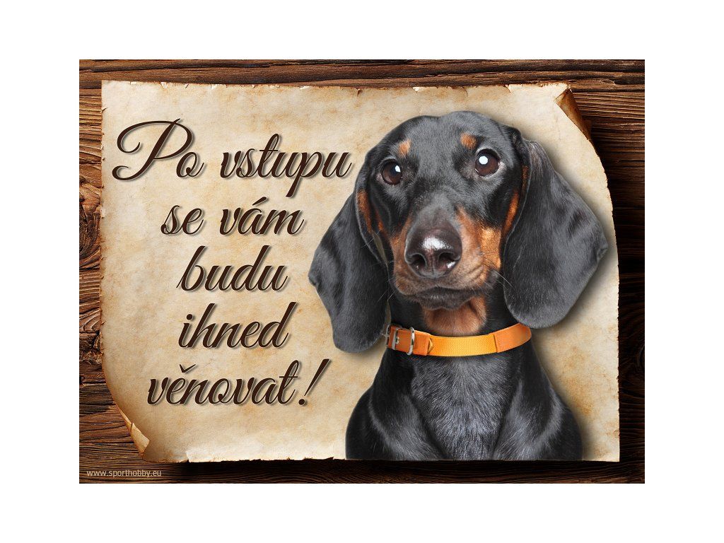 Cedulka Jezevčík černý hladkosrstý hliníková s nápisem "Po vstupu se vám budu hned věnovat!" Kovová výstražná venkovní cedulka oznamující to či ono, že se ve vašem obydlí může návštěvník setkat s vašim čtyřnohým miláčkem a jeho teritoriem. Velikosti těchto cedulek jsou 15x11,25 a 20x15 cm. Cedulky jsou tištěny sublimační technologií Grawerton přímo na plech. Cedulky dodáváme běžně se zakulacenými rohy. Pokud budete chtít na cedulku vlastní text, napište nám jej do poznámky.