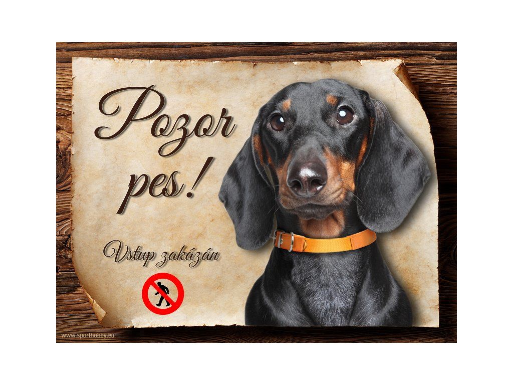 Cedulka Jezevčík černý hladkosrstý hliníková s nápisem "Pozor pes! Vstup zakázán." Kovová výstražná venkovní cedulka oznamující to či ono, že se ve vašem obydlí může návštěvník setkat s vašim čtyřnohým miláčkem a jeho teritoriem. Velikosti těchto cedulek jsou 15x11,25 a 20x15 cm. Cedulky jsou tištěny sublimační technologií Grawerton přímo na plech. Cedulky dodáváme běžně se zakulacenými rohy. Pokud budete chtít na cedulku vlastní text, napište nám jej do poznámky.